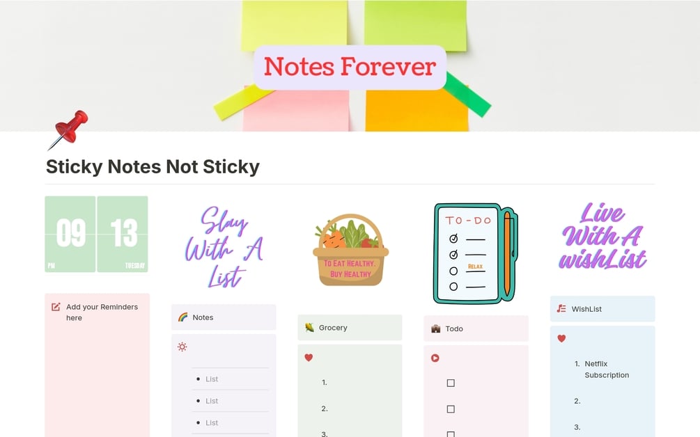 This Sticky Notes Notion template will ease your life by having all the sections for reminders, notes, to-do lists and grocery lists on one page.